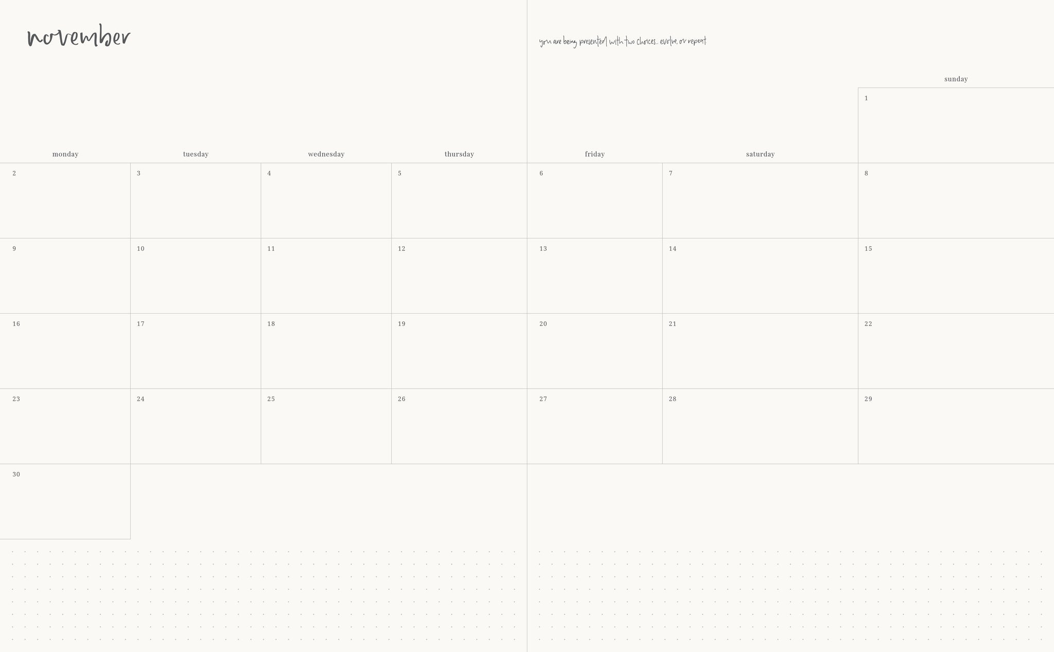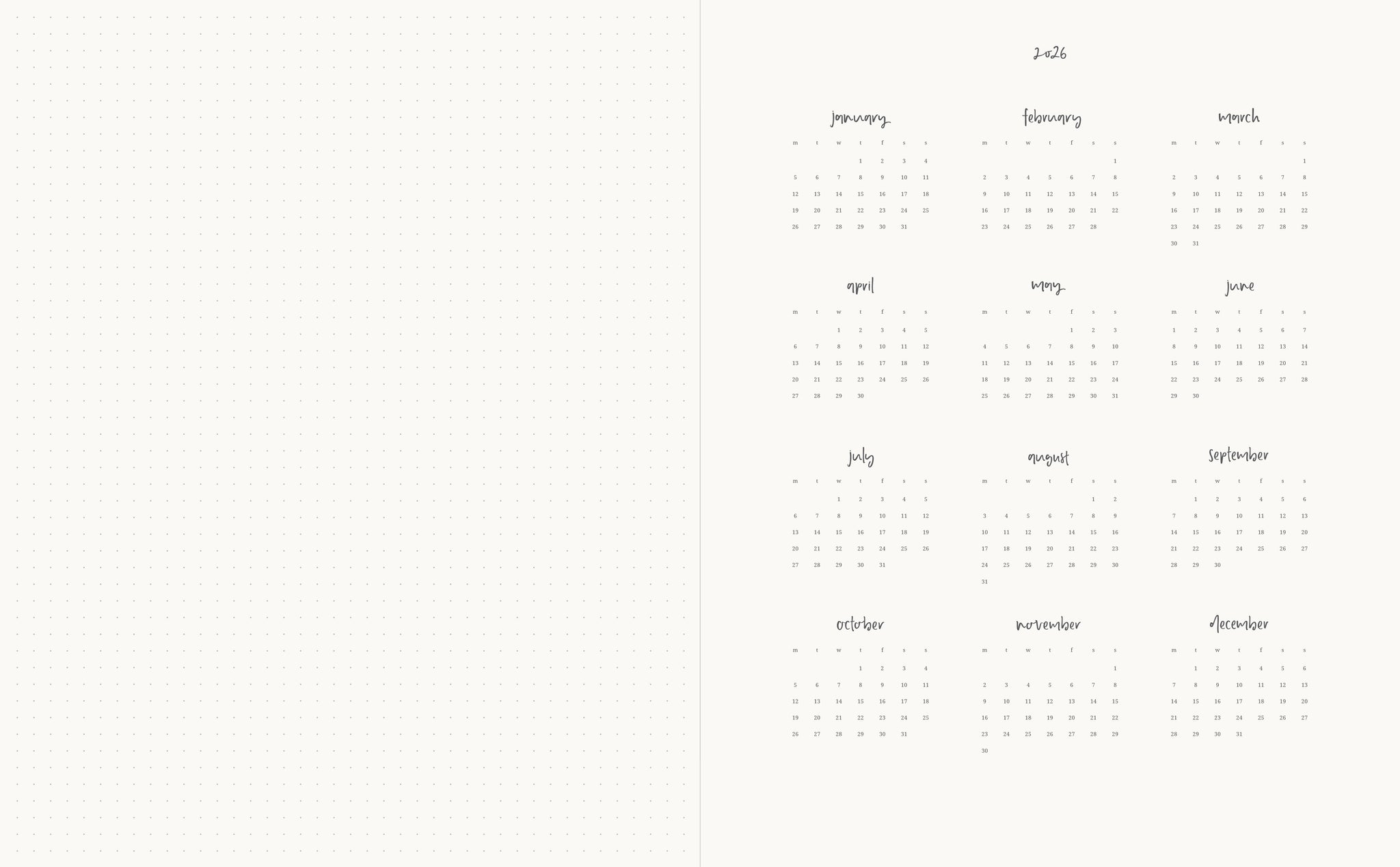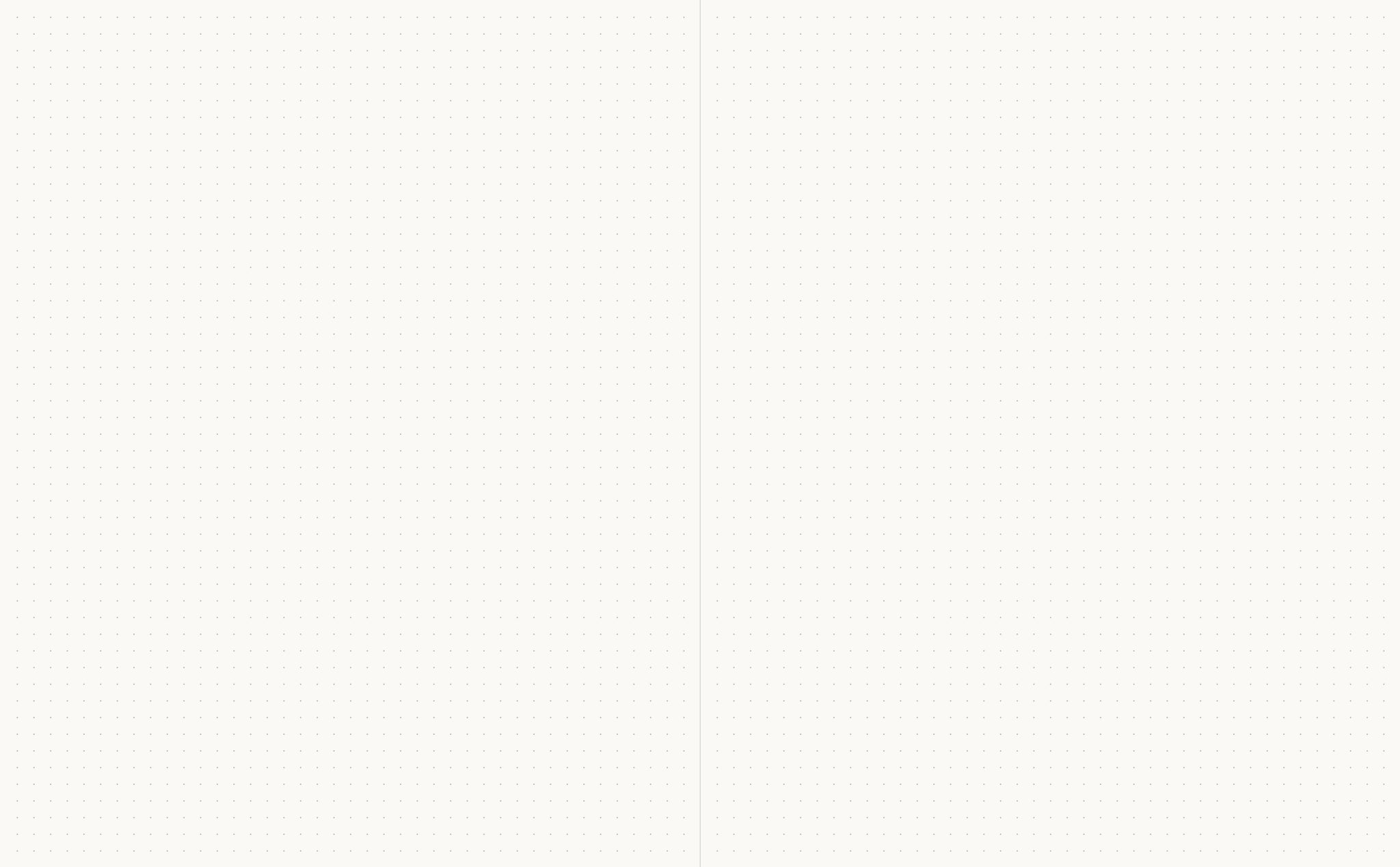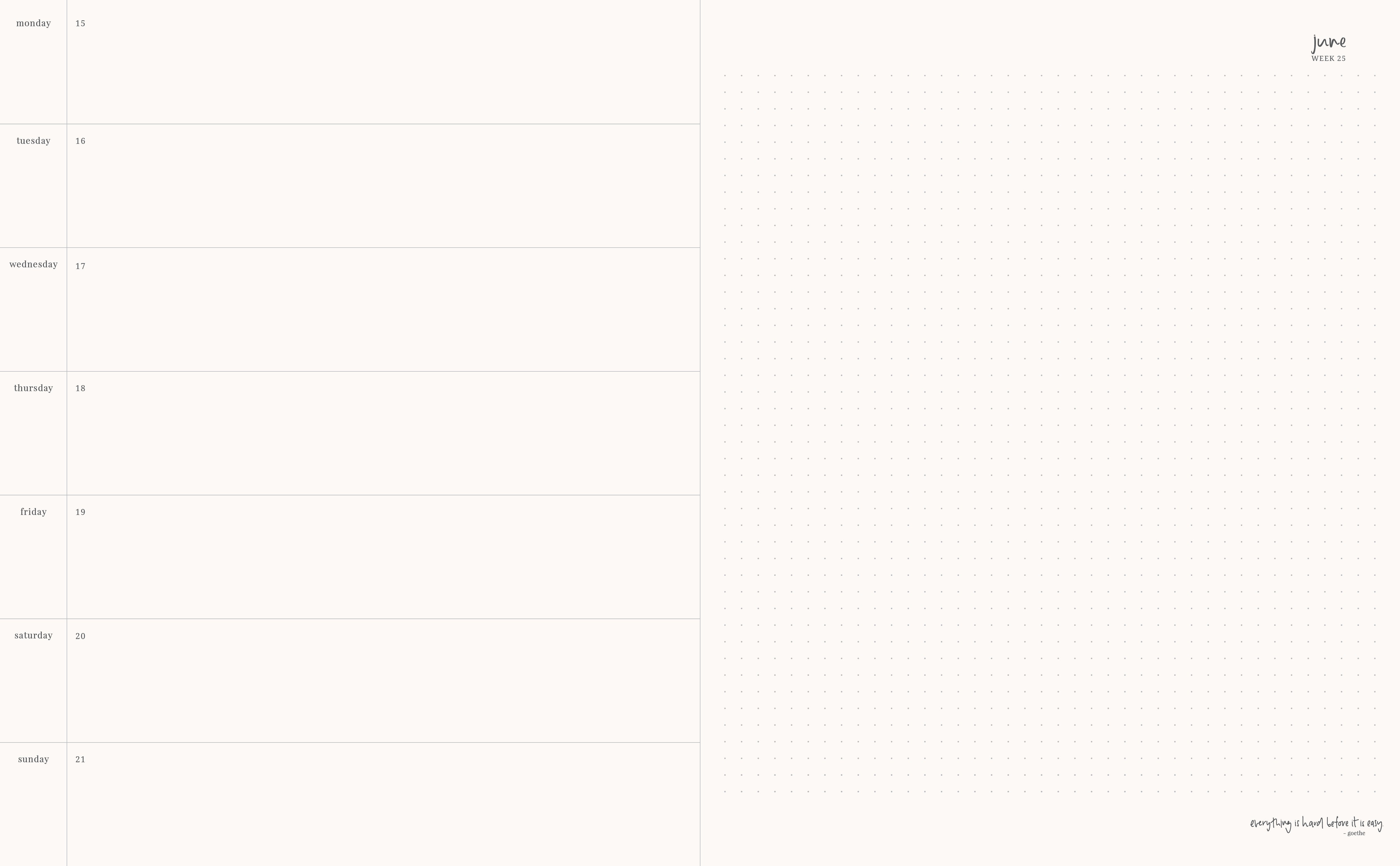 This layout is for those who like a blend of structure and freedom. Less space is allocated to each individual day of the week, with the left page holding your week in a clean horizontal format running down the page, and right page offering a full dot grid for anything you need.