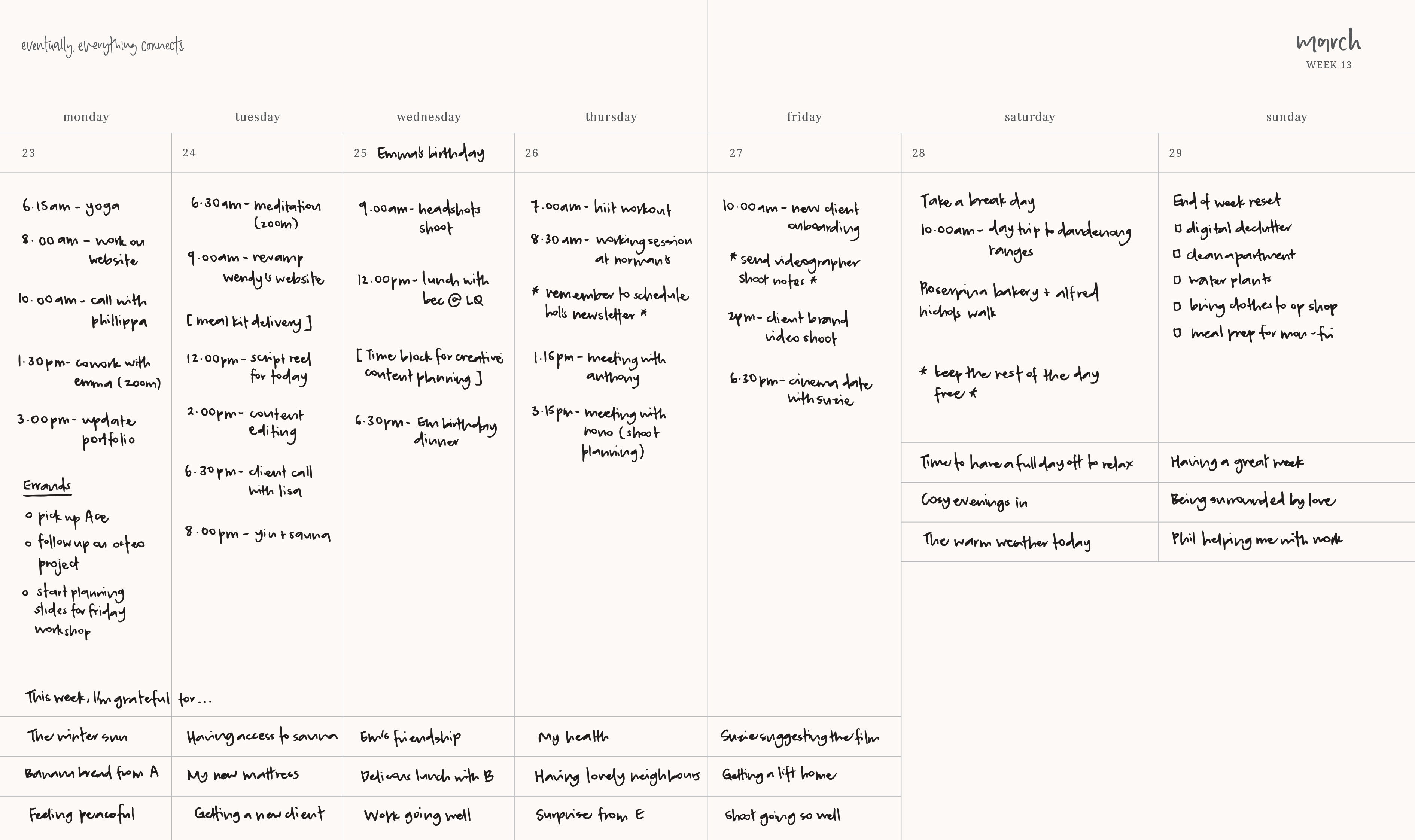 There’s flexibility to segment your day, allocate blocks of time, and record time-based meetings and appointments while also allowing space for your daily to-do list. The three lines at the bottom of each day offer dedicated space for listing your top priorities, meal plans, things to remember, or your gratitude list.