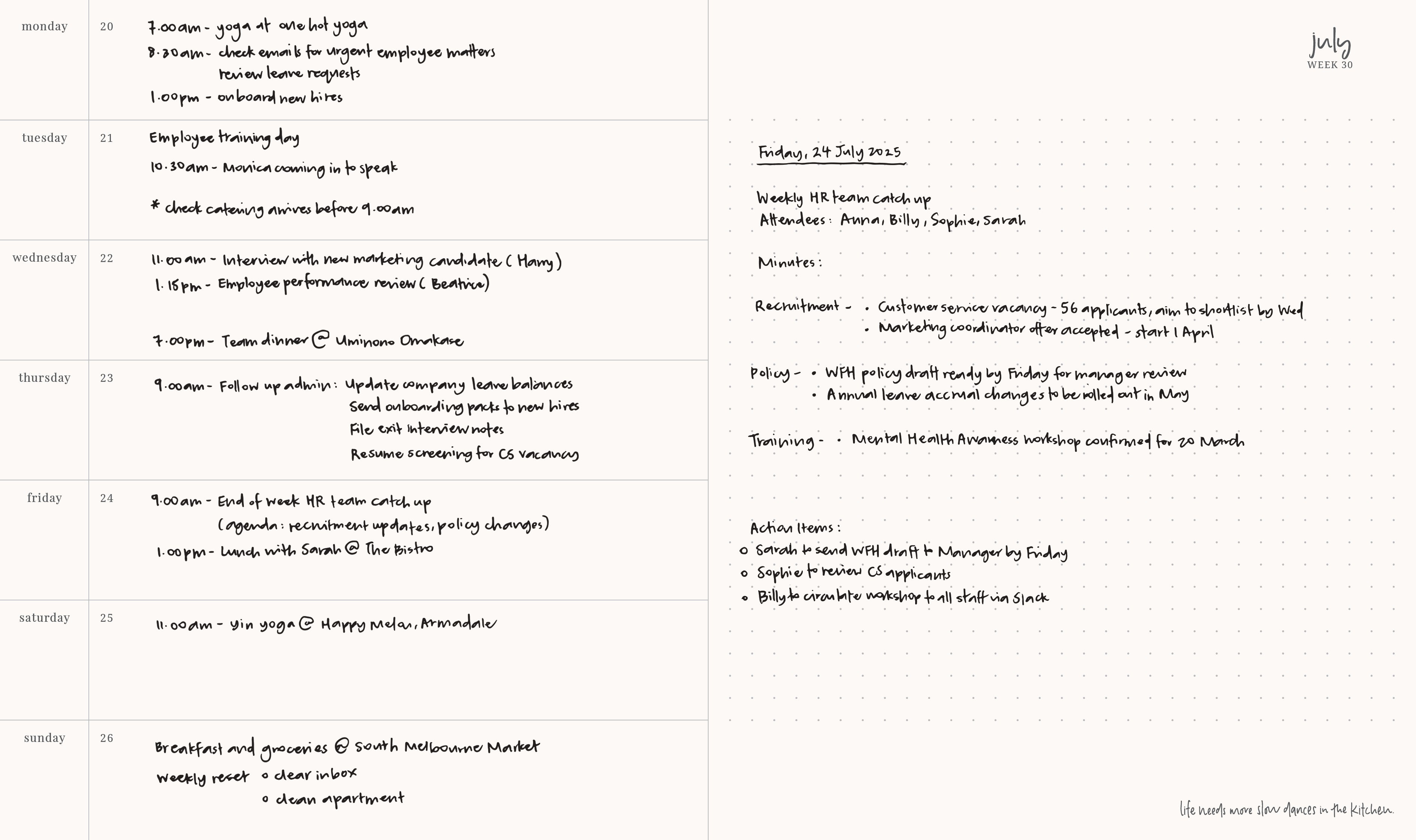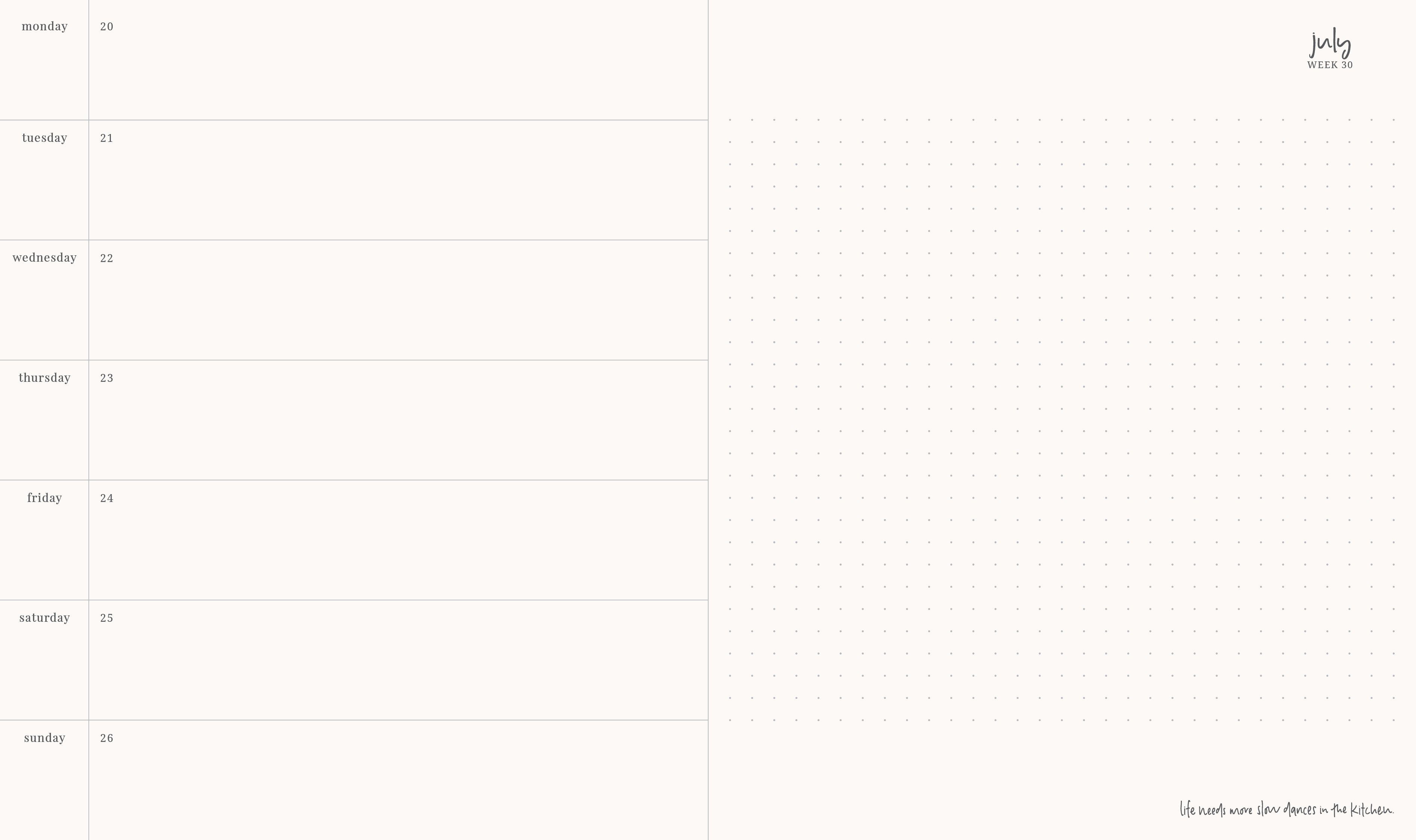 is for those who like a blend of structure and freedom. Less space is allocated to each individual day of the week, with the left page holding your week in a clean horizontal format running down the page, and right page offering a full dot grid for anything you need.